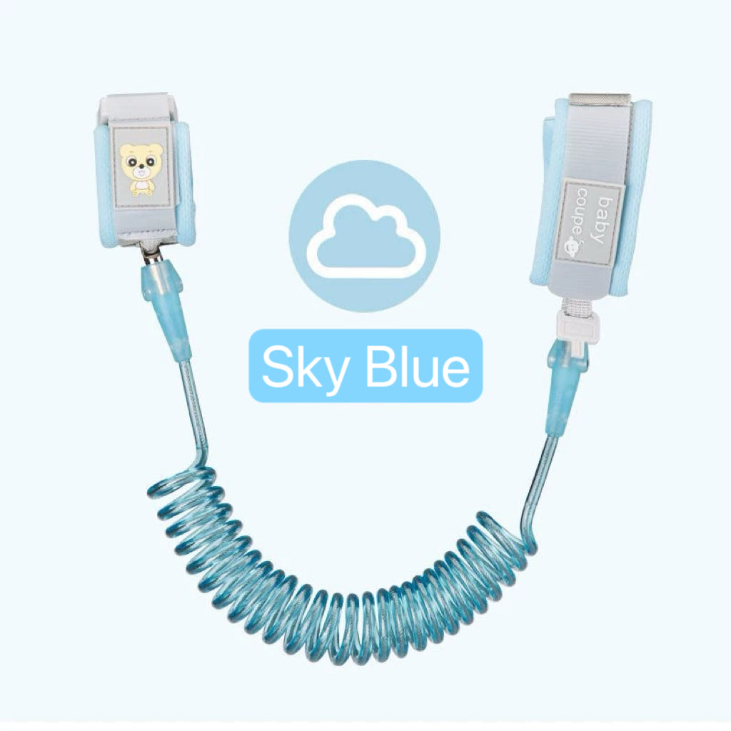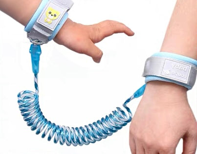 One end around parent’s wrist while another around the child. Small lock on parent’s wrist so as child cannot unlock theirs on their own.