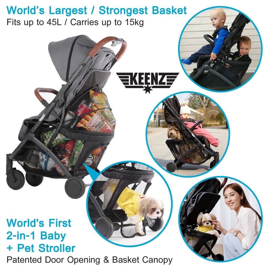 - World's First 2-in-1 baby + pet stroller with zippered pet door! This patented opening allows the pet to easily move in & out of the basket if needed. It also allows easy access to the basket even when the seat is fully reclined, unlike others.