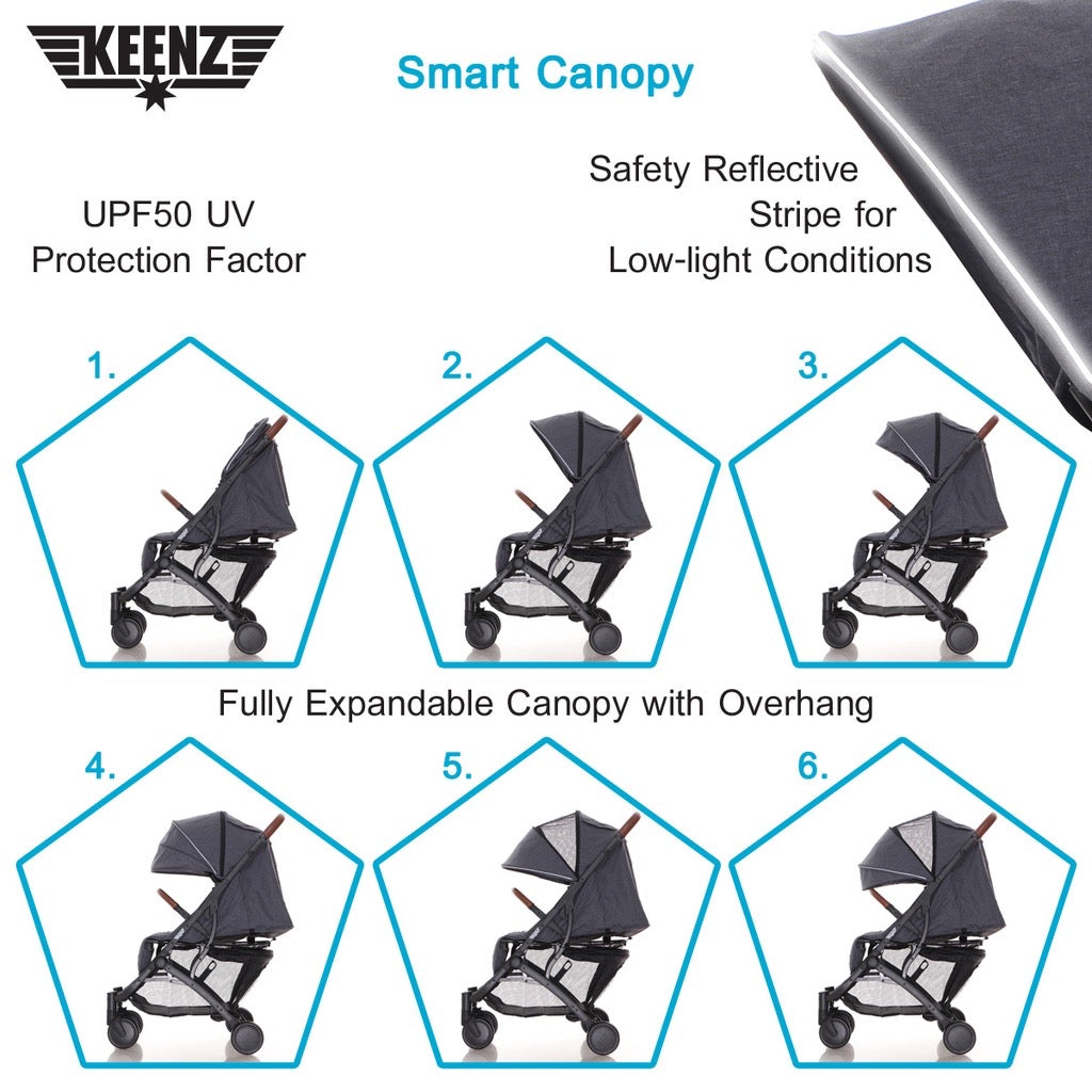 - Smart Canopy (fully expandable canopy with overhang, UPF50 UV protection factor, multiple strategic large mesh windows for maximum airflow, large parent supervision window, safety reflective stripe for low-light conditions)