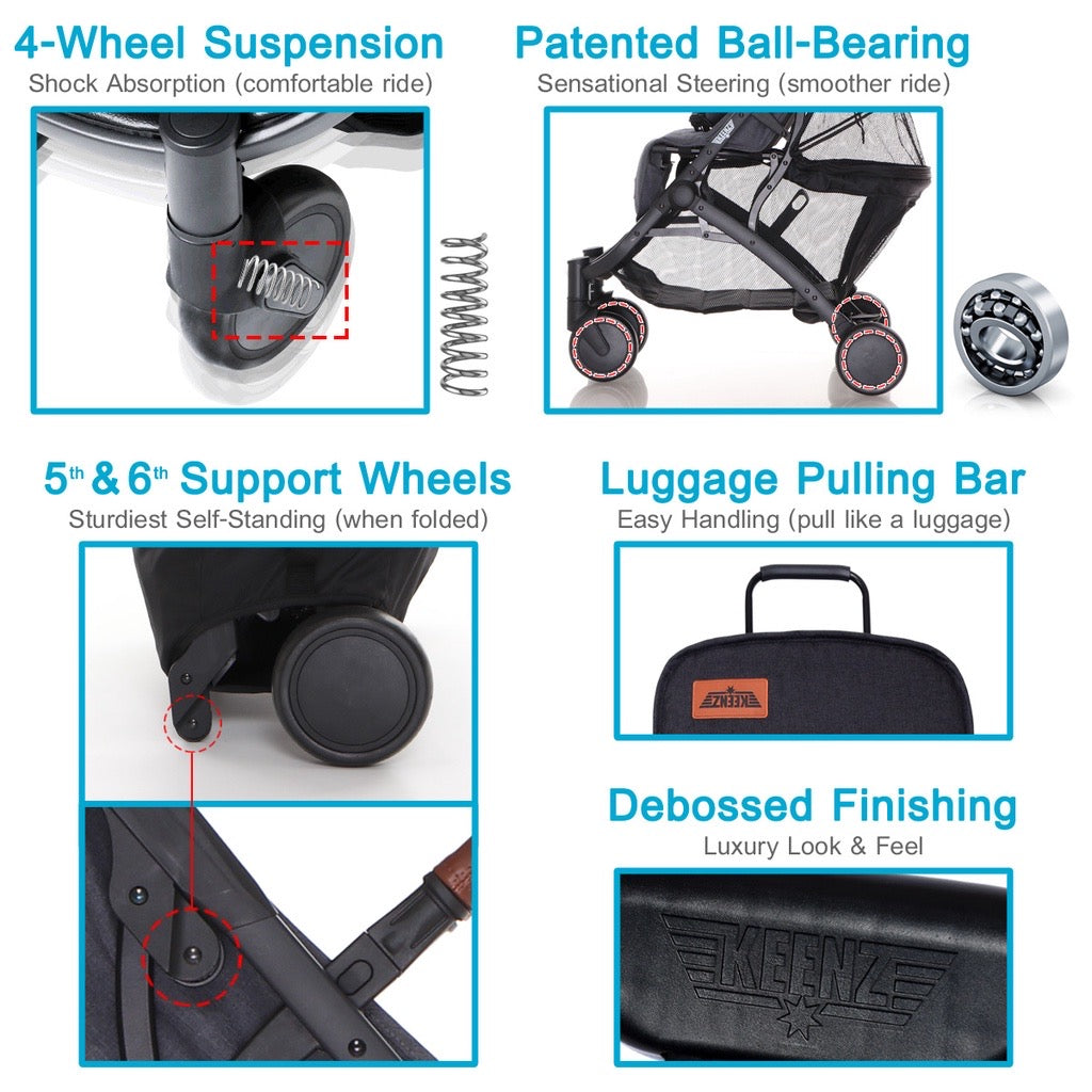 Uniquely designed, the Keenz Air Plus 2.0 is the best and perfect lightweight cabin-friendly stroller for the family. It weighs only 6.8kg (without wheels, belly bar and accessories) but can be used from newborns till 30kg. This is the strongest compact stroller in the world, with stunning features and comes in a great value package. In fact, this is the only stroller that you ever need! It is one of the top selling models in Singapore with thousands of happy Singapore parents using and trusting it. So what are you waiting for?