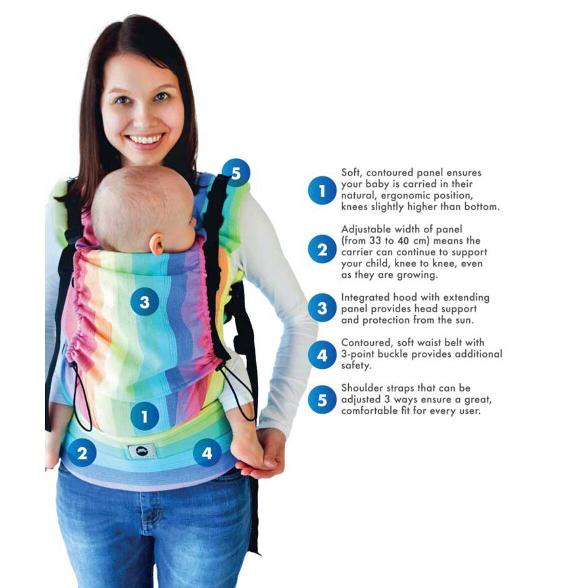 Suitable for baby from 4 - 20 kg (approx 1 month - 24 months). Adjustable panel allows carrier to grow with your child.