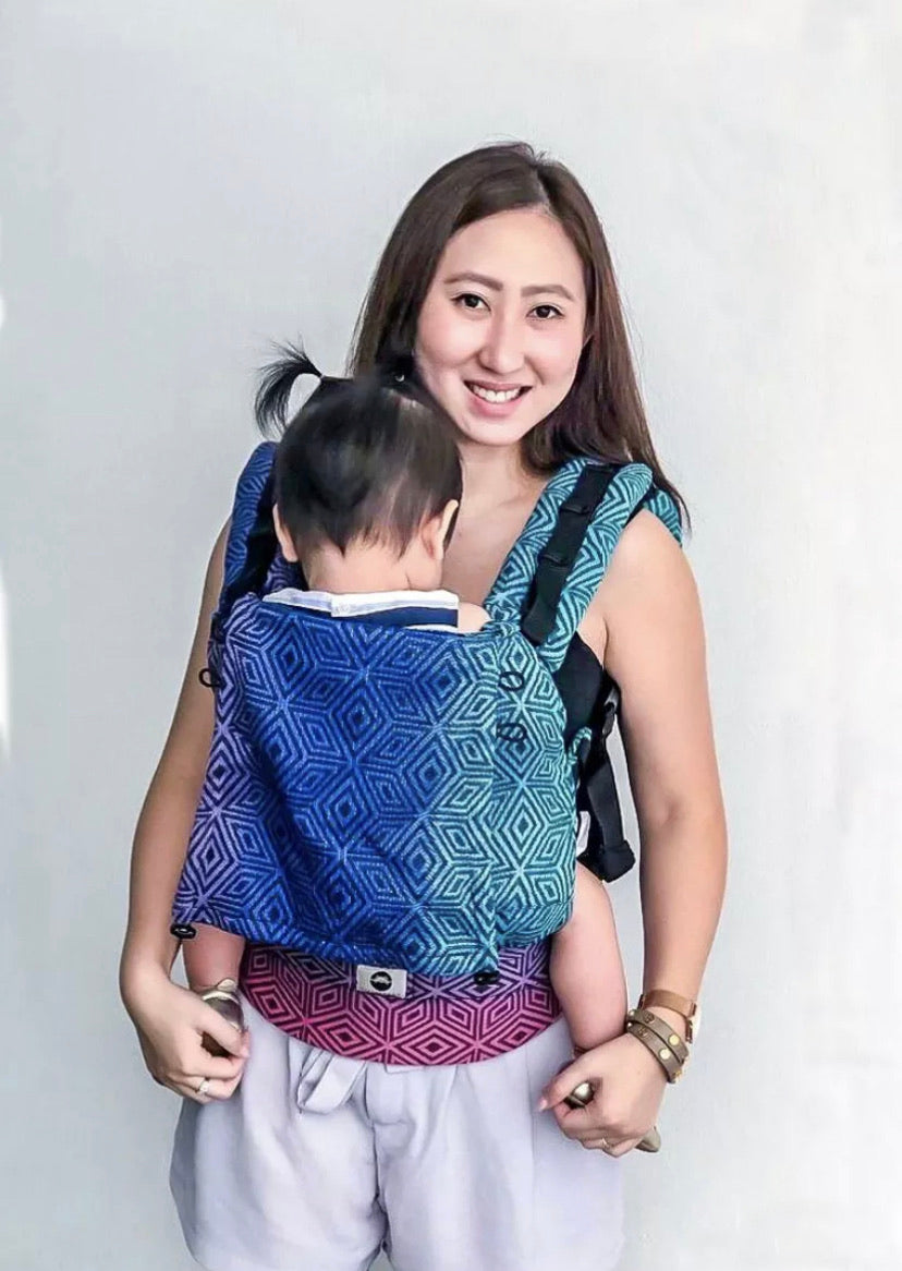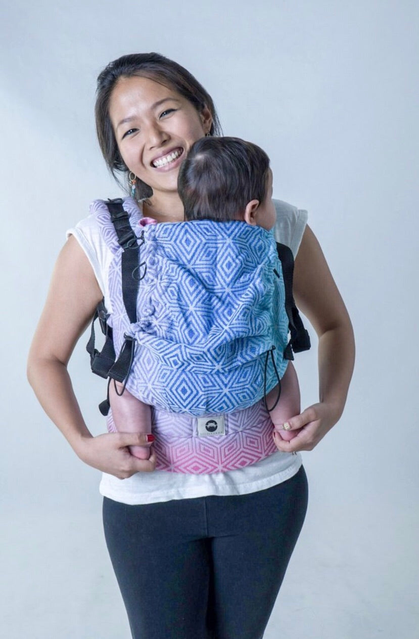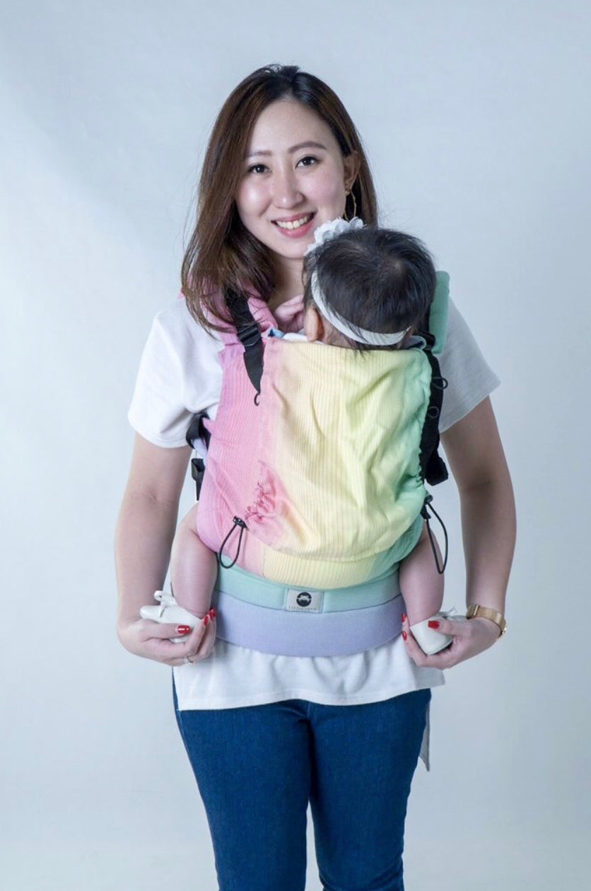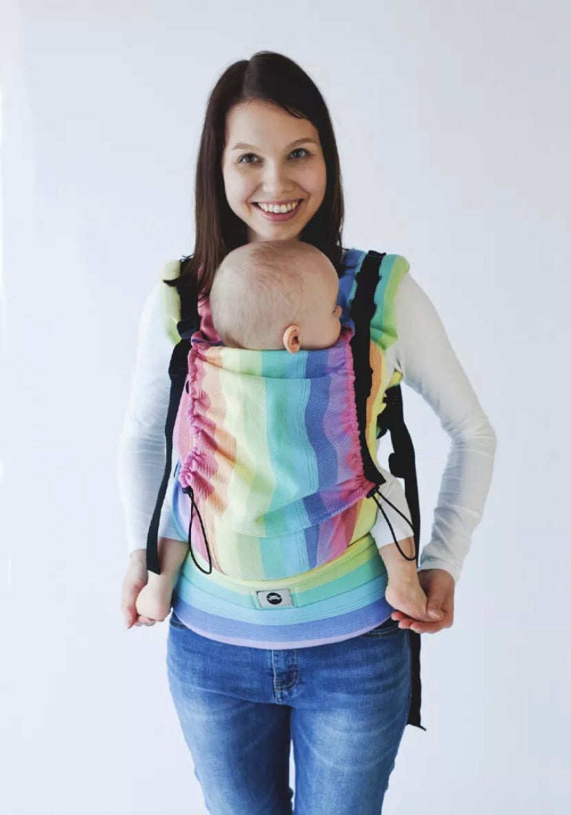 This is an ergonomic Soft Structured Carrier where your baby’s spine has full support, kept natural position and knees are placed above the bottom, in the well-known position called “M” shape seating