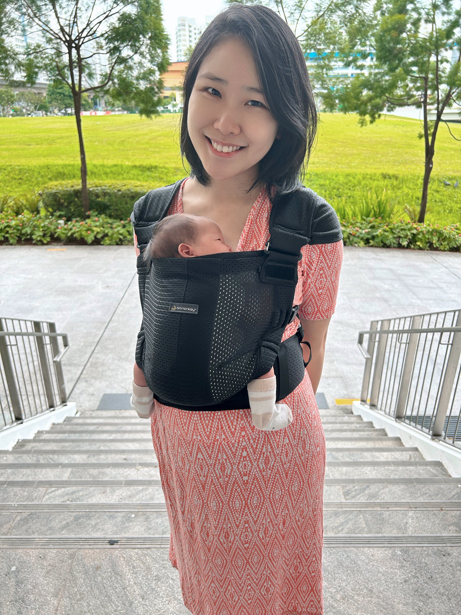 It just wears super comfortable and is also very easy to use. Whether you carry a big or small baby, you don’t need to adjust the carrier to your baby’s size beforehand. The height and width of the carrier automatically form a nice tight fit around your baby’s body. So it always fits and literally grows with your baby.