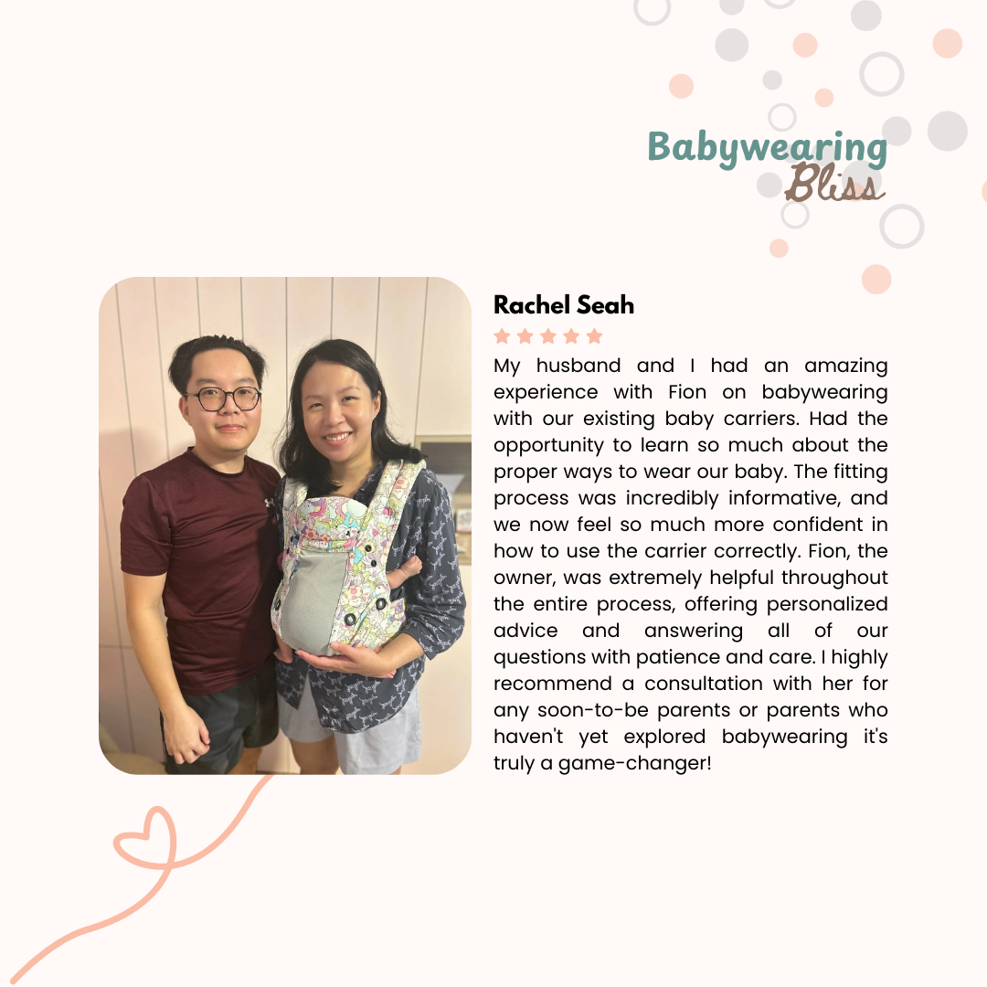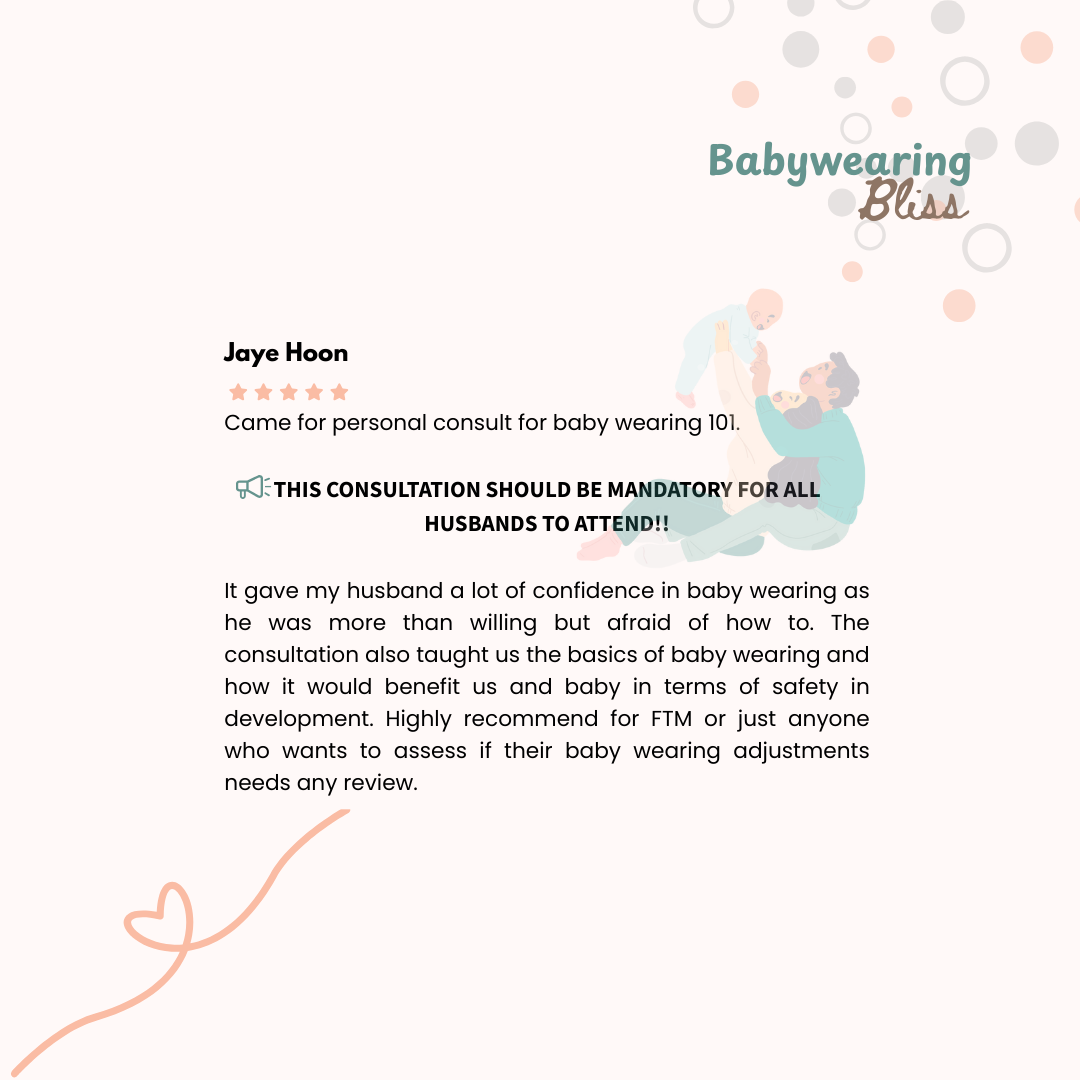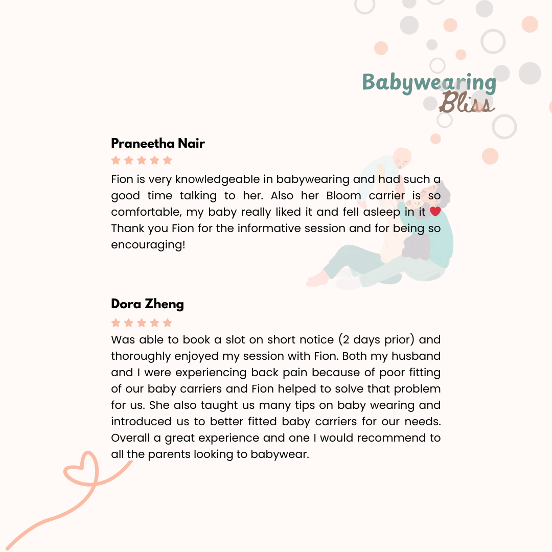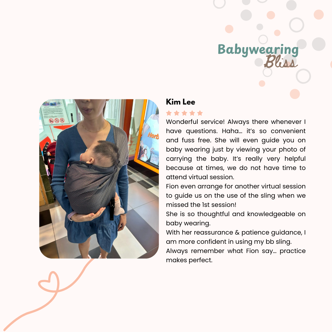 4) Your own set of questions to seek clarification with our qualified consultant (Fion Koh, registered nurse, certified Babywearing educator, mother of 4)